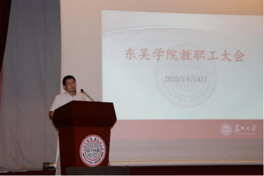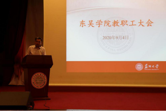 9月4日下午,东吴学院召开首次教职工大会。苏州大学副校长蒋星红出席会议。学院领导班子成员及全体教职员工共两百余人参会。会议由学院党委书记刘枫主持。