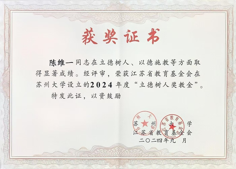 为深入学习贯彻习近平总书记关于教育的重要论述,大力弘扬教育家精神,加强学校师德师风建设,努力培养造就一支高素质专业化教师队伍,我校认真组织开展2024年度苏州大学“立德树人奖教金”评选工作。我院陈维一老师脱颖而出,与全校其他8位优秀教师共同荣获“立德树人奖教金”,陈唯一老师也是东吴学院成立后第一个获此殊荣的优秀教师。