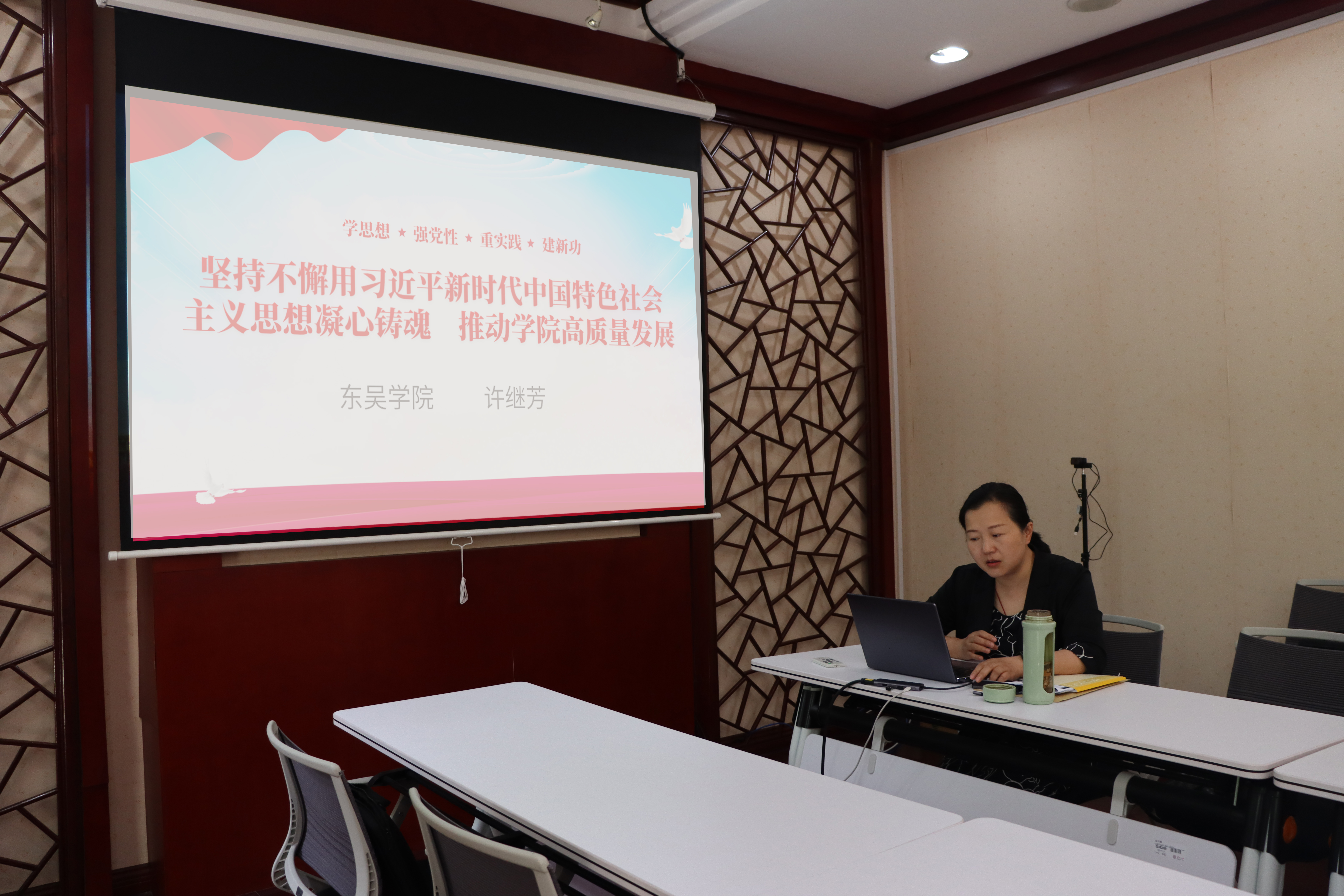 许继芳书记指出,坚持不懈用习近平新时代中国特色社会主义思想凝心铸魂,培养担当民族复兴大任的时代新人,是东吴学院全体教师肩负的重要职责。要通过主题教育,进一步深刻领会习近平总书记和党中央对建成教育强国的强烈期盼和殷殷嘱托,抓住主题教育大调研的重要契机,抓好学院公共课程教育教学改革谋划设计工作,进一步落实立德树人根本任务,全面深化本科人才培养改革,努力提高我校人才培养质量,立足本职、凝心聚力推动学院各项事业高质量发展。