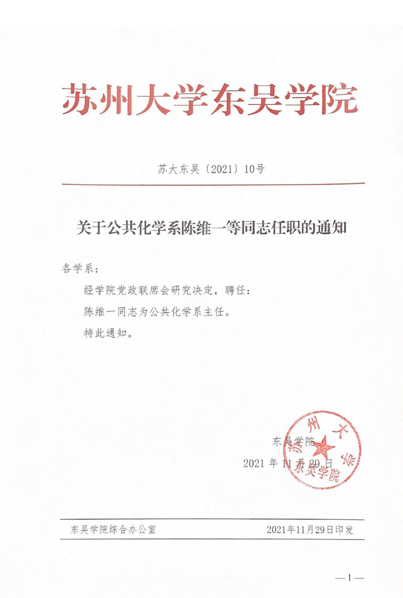 关于公共化学系陈维一同志任职的通知 ( 苏大东吴〔2021〕10号 )