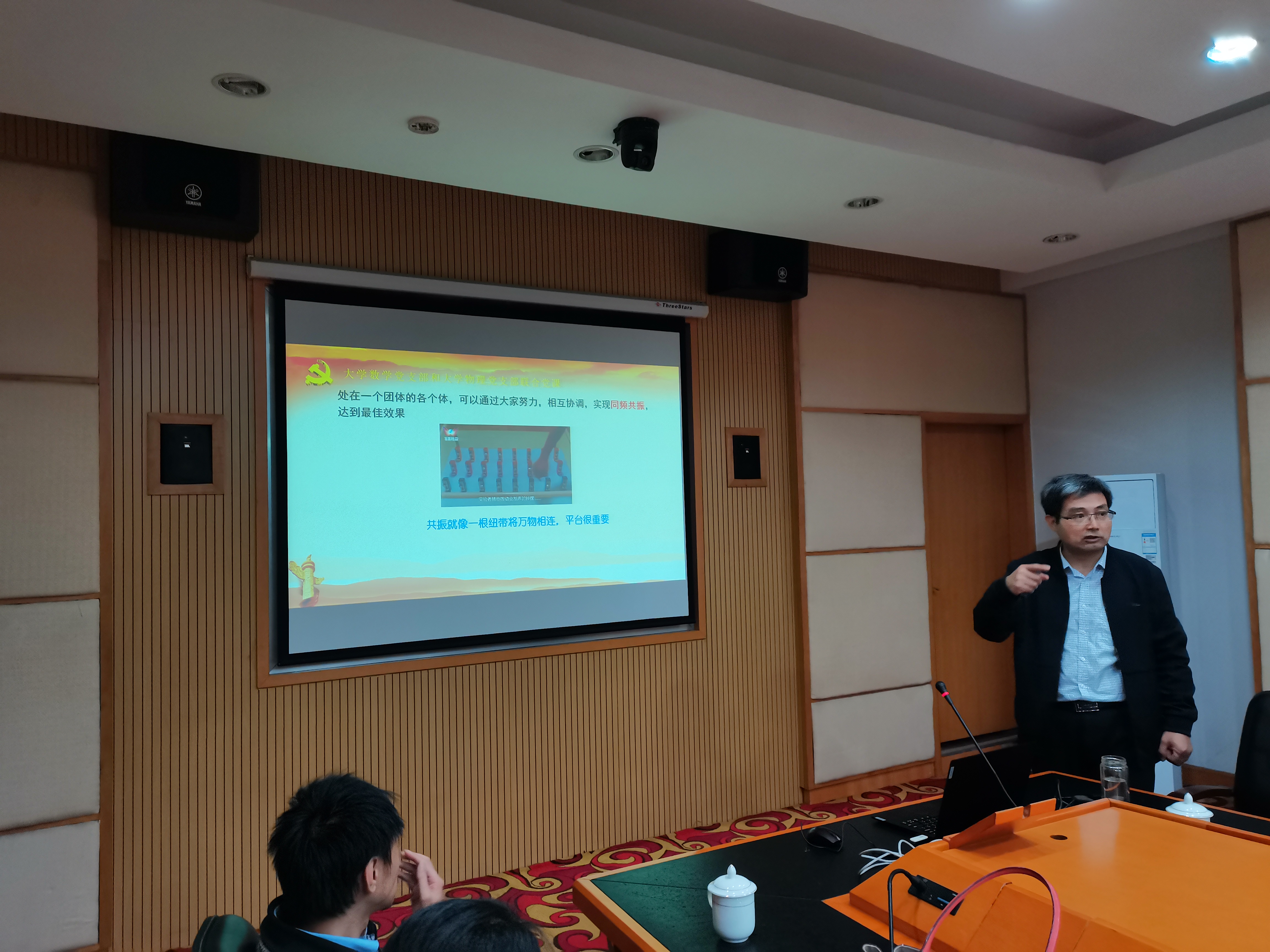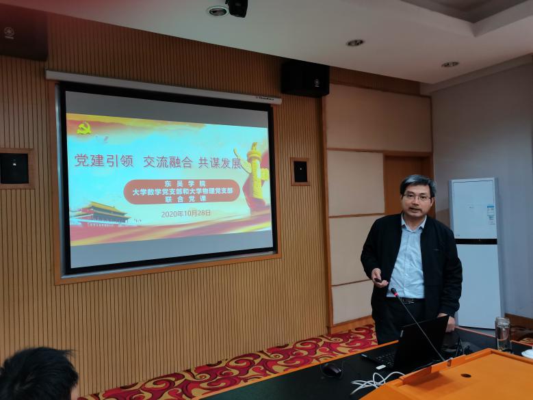 2020年10月28日下午,东吴学院大学物理党支部与大学数学系党支部,在红楼201会议室,上了一堂题为“党建引领 交流融合 共谋发展”的联合党课。