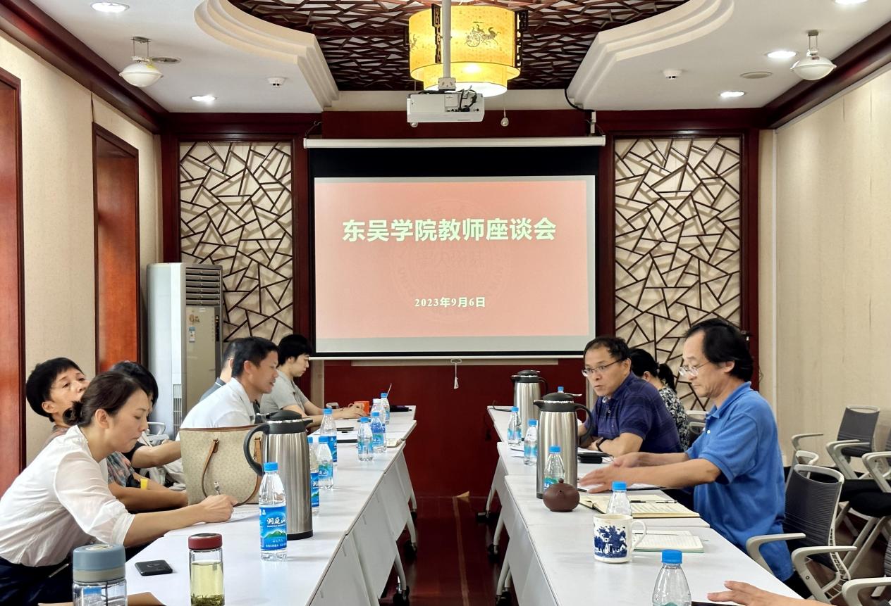 9月6日下午3点,东吴学院在冬瑞楼二楼会议室召开教师座谈会。东吴学院领导班子、院长助理、系主任、支部书记、工会委员、民主党派教师参加会议,结合学校庆祝2023年教师节活动开展我院教师座谈,听取广大一线教师对学校、学院高质量发展过程中的意见和建议。