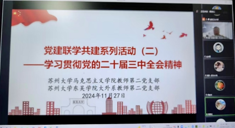 2024年11月27日晚,东吴学院大学外语系教师第二党支部携手马克思主义学院教师第二党支部,通过腾讯视频会议平台,共同举办了学习贯彻党的二十届三中全会精神的共建联学活动。东吴学院大学外语系教师第一和第二党支部以及马克思主义学院教师第二党支部全体党员参加了本次活动。活动由马克思主义学院教师第二党支部书记罗志勇主持。