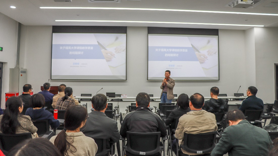 讲座伊始,主持人张健院长对讲座主讲人、在座与会人致以问候,欢迎大家的到来,并就王栓宏教授的研究领域以及在教学、科研方面的贡献进行简要介绍。随后,王栓宏教授作了题为 “关于提高大学课程教学质量的问题探讨”的专题讲座,讲座以教育部与省厅相关文件要求为起点,依据教育部审核评估指标体系,结合相关教材案例,从教学研究和课程建设两个方面阐述大学课程如何在“备课、讲授、讨论、答疑、作业和考核”六环节上提升教学质量,并进行合理的课程思政设计。讲座后我院教师与王教授就教学资源共享、课程思政设计等实际应用问题进行了深入详尽的研讨。