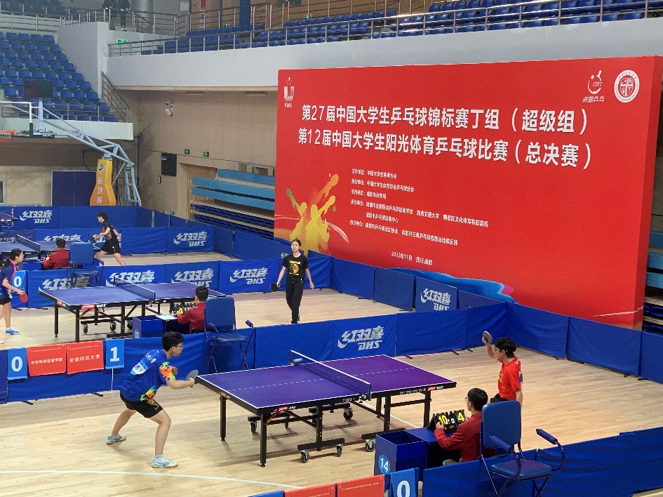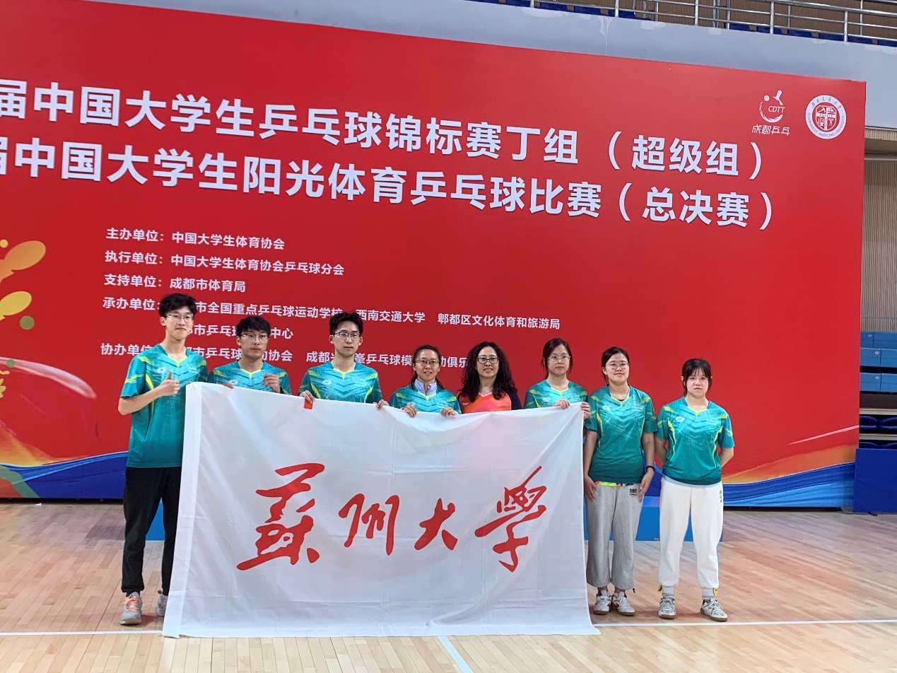 2023年11月25日,第12届中国大学生阳光体育乒乓球比赛(总决赛)在天府成都的西南交通大学体育馆举行,在东吴学院张曜老师和李井平老师的带领下,苏大乒乓球队的队员们一路过关斩将,最终获得了混合团体第四、男子单打第二和第五、女子单打第五的好成绩。这是苏大阳光组乒乓球队第二次参加全国性赛事,获得了佳绩!