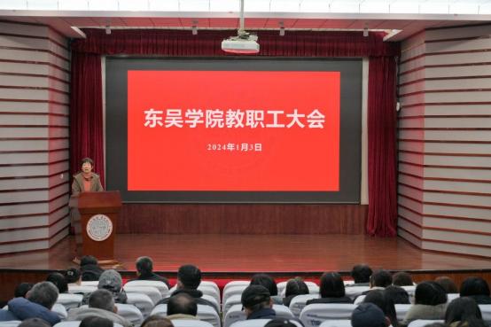 1月3日下午,东吴学院在红楼学术报告厅召开全体教职工大会。会议由学院党委书记许继芳主持。喻翔玮、江美福分别布置了学期末教学工作,强调了试卷保密、考试秩序和纪律、阅卷规范等方面的要求。