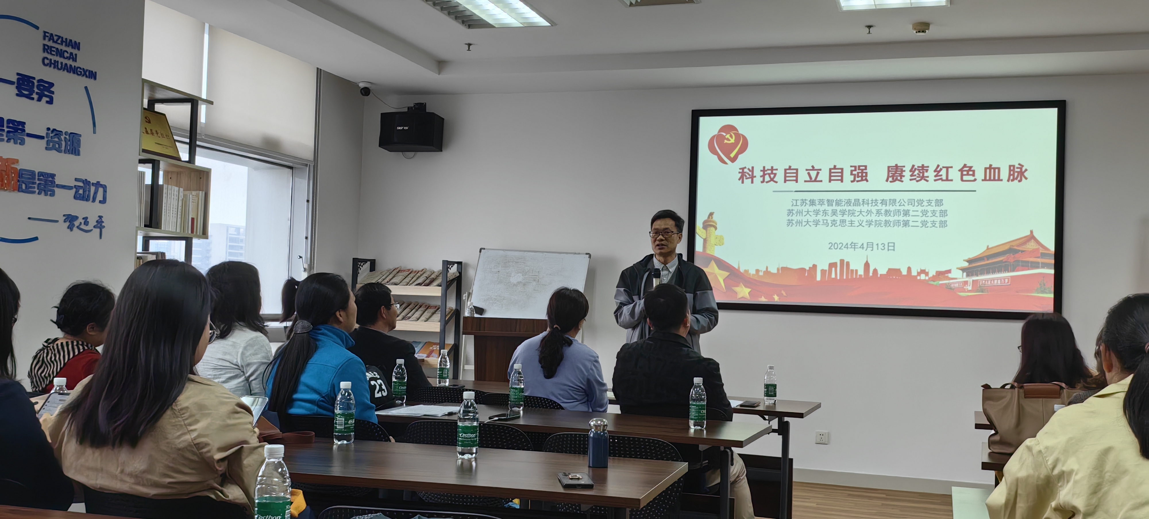 2024年4月13日,为了传承和弘扬红色革命精神,赓续红色血脉,认真学习习近平总书记关于科技自立自强系列重要讲话精神,提升党员的政治觉悟和思想认识,苏州大学东吴学院大外系教师第二党支部、苏州大学马克思主义学院教师第二党支部和江苏集萃智能液晶科技有限公司党支部联合开展了“科技自立自强,赓续红色血脉”主题党日活动。苏州大学东吴学院大外系教师第二党支部、苏州大学马克思主义学院教师第二党支部及江苏集萃智能液晶科技有限公司党支部的党员积极参与了此次活动。