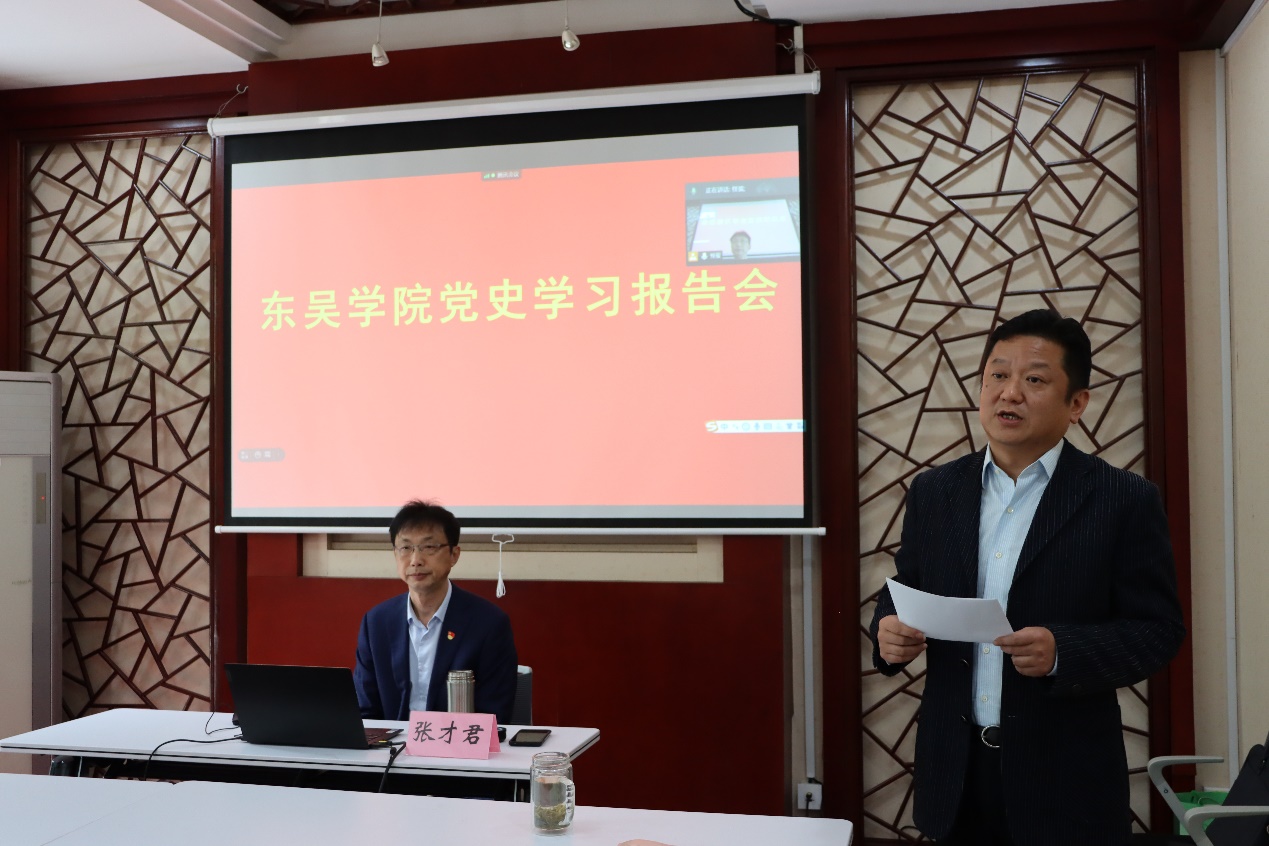 本次报告邀请了校党史学习教育宣讲团成员、马克思主义学院教授张才君开展名为《奋斗百年路 启航新征程——庆祝中国共产党成立100周年》的专题报告。他从“中国共产党的历史、奋斗百年路、启航新征程”三个篇章导学了中国共产党的百年奋斗史,以宏大史观的角度学党史看国史,用真实的故事、感人的事例、精准的数据为大家再次呈现了中国共产党的艰辛奋斗和伟大成就、光辉理论和宝贵经验。他希望,东吴学院全体党员全面看待党史、进一步修好党史这门课,做到知其然、知其所以然、知其所以必然,从中领悟新的体会、新的认识,武装思想,提升思想力、领导力和工作力,注重知行合一。