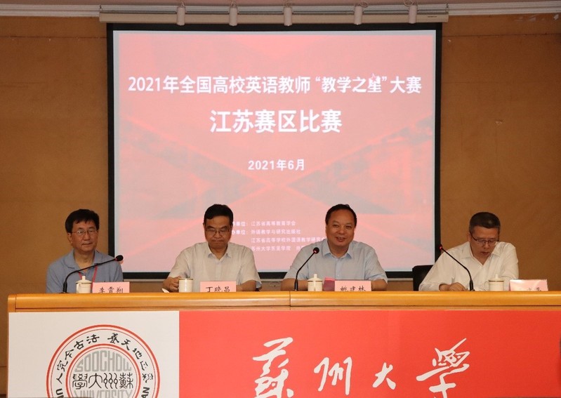 6月4日上午,2021年全国高校英语教师“教学之星”大赛江苏赛区比赛开幕式在苏州大学红楼会议中心举行。江苏省高等教育学会丁晓昌会长,苏州大学党委常委、副校长姚建林教授,江苏高校外语教学研究会李霄翔常务副会长,外研社华东信息中心王建平主任,苏州大学教务部部长方亮教授,江苏省高校外语教学研究会副会长、苏州大学外国语学院院长朱新福教授以及来自各地的评审专家出席了开幕式,开幕式由东吴学院院长张健主持。