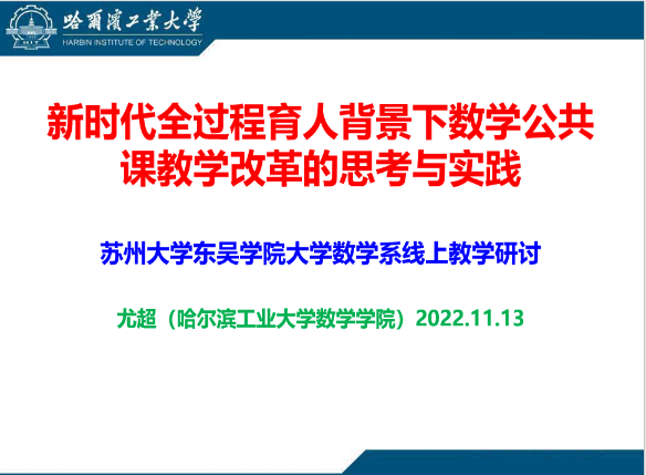 接着,我们邀请了哈尔滨工业大学数学学院数学教学研究中心副主任、党支部书记、黑龙江省青年教学名师尤超教授作题为“新时代全过程育人背景下数学公共课教学改革的思考与实践”的线上报告。尤教授的报告主要从课程及团队概况、课程思政教学实践、全过程人才培养实践这三个方面展开。他结合多年从事一线教学的经验,从备课、讲授、答疑、作业等教学环节分享了自己的具体做法,使我们深受启发。在报告的提问环节,与会老师就高等数学先修课以及答疑等问题与尤教授进行了交流探讨。