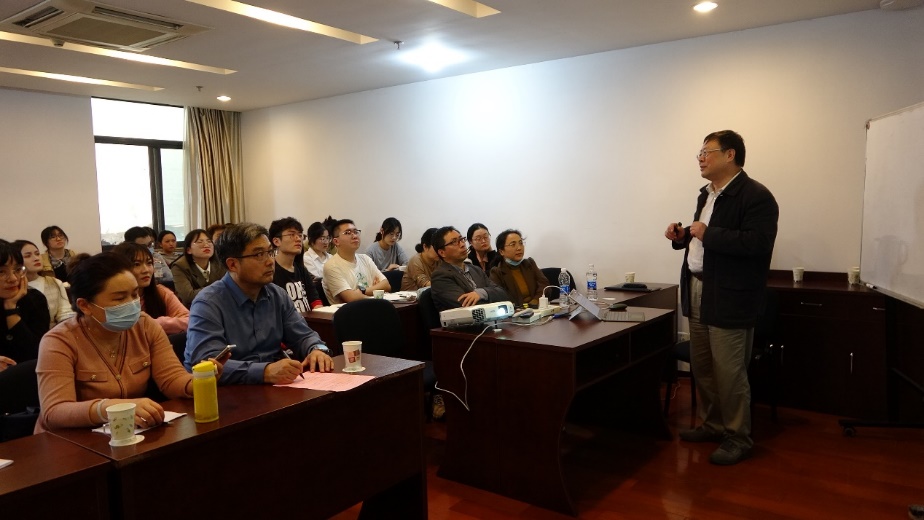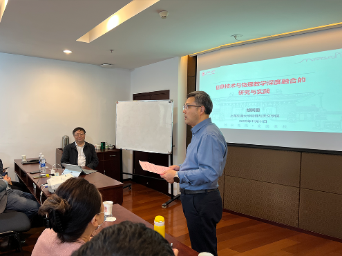 讲座伊始,主持人江美福院长对讲座主讲人、在座与会人致以问候,欢迎大家的到来,并就胡其图教授的研究领域以及在教学、科研方面的贡献进行简要介绍。随后,胡教授作了题为 “信息技术与物理教学深度融合的研究与实践”的学术报告,报告从传统领域新形态教材建设与信息技术与物理教学深度融合两个维度展开。报告后我院及兄弟学院的教师与胡老师对于新形态的信息技术与系统平台的结合、线上平台中学生的交流互动、平台互动问题的探究、物理仿真实验、增强现实等实际应用问题进行了深入详尽的研讨。